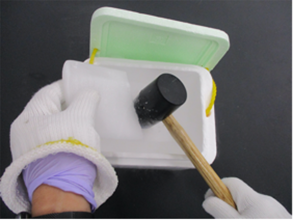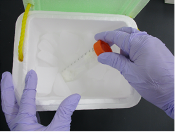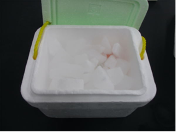 サンプルボックスを、輸送用の保冷箱につめてください。この際、サンプルボックス全方位を覆うように、十分量のクラッシュされたドライアイスをご利用ください。サンプル保存状態が冷蔵の場合は、アイスパックなどを適宜ご利用ください。