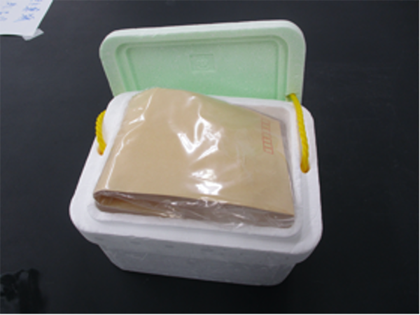 QCシートや御見積書・お打合せメールなどの印刷物を、防水のためビニール袋にいれてください。サンプルボックス・QCシートなどが入った保冷箱にフタをし、周囲をしっかりテープで固定してください